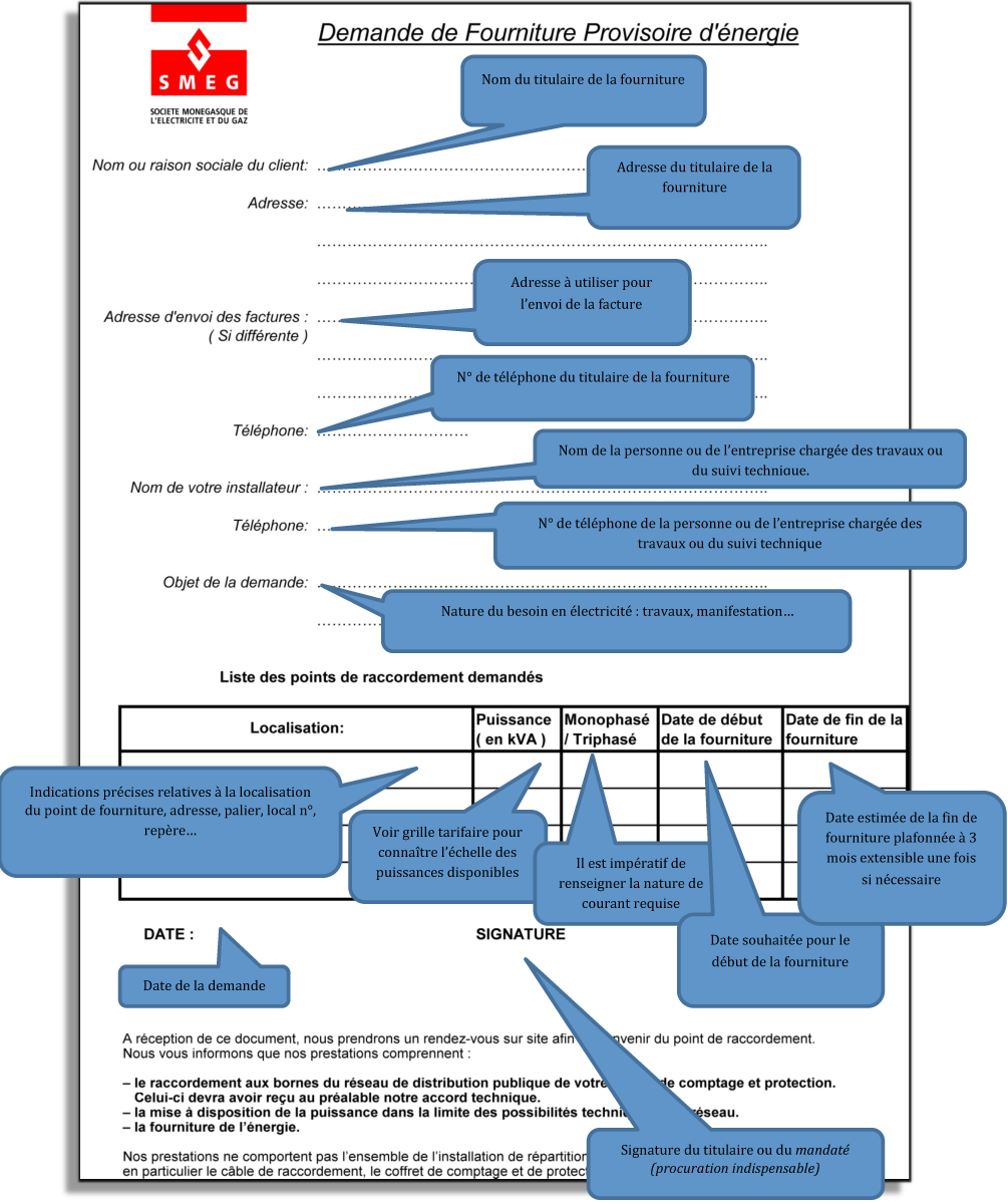 Afin de déterminer celui-ci, veuillez nous retourner nous retourner le document "Demande de fourniture provisoire d'électricité" dûment complété à SMEG - BP 633 - 98013 Monaco Cedex ou par fax au 92 05 05 02.